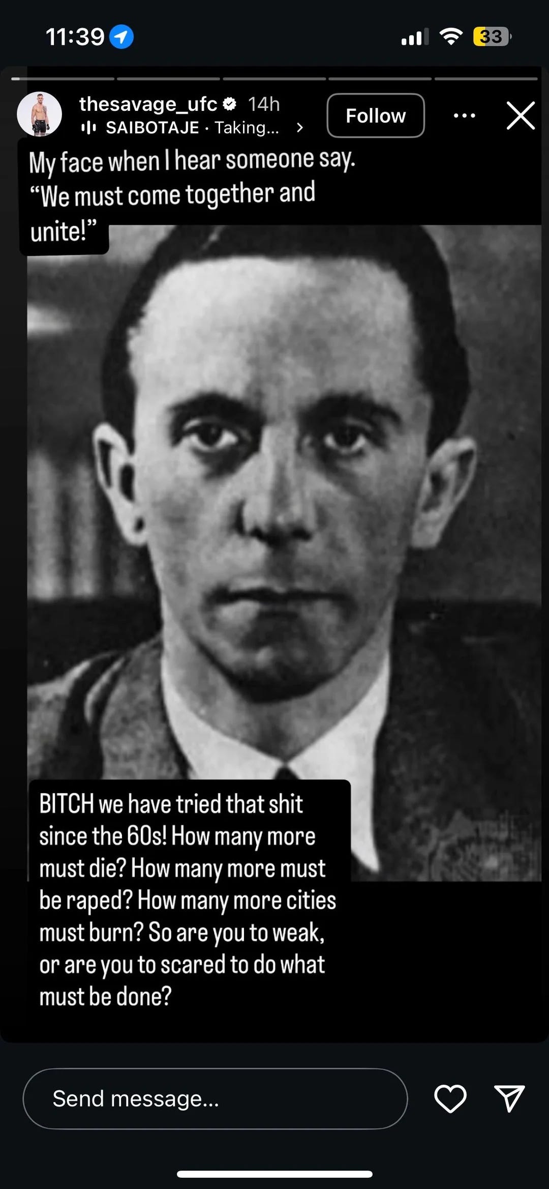 UFC fighter AJ Cunningham took it a step further, sharing a picture of Joseph Goebbels, the chief propagandist for the Nazi party, along with the caption: My face when I hear someone say ‘we must come together and unite.’