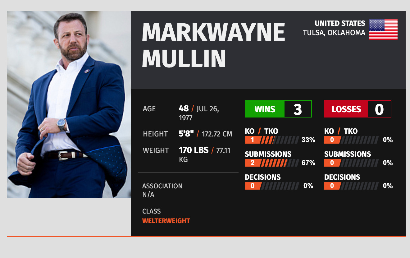 Mullin also wrestled in college and is officially 3–0 in MMA, though he has claimed a 5–0 record. He was inducted into the Oklahoma Wrestling Hall of Fame in 2016. The following year, while serving as a congressman, Mullin proposed legislation that would force the UFC to share financial information with fighters and create an independent ranking system that would offer fighters greater leverage when negotiating with the organization. The UFC fiercely opposed the bill, called the Muhammad Ali Expansion Act, and reportedly spent upwards of $100,000 lobbying against it. “I wish the UFC would use that money to pay their fighters instead of lobbying against them,” Mullin said at the time.