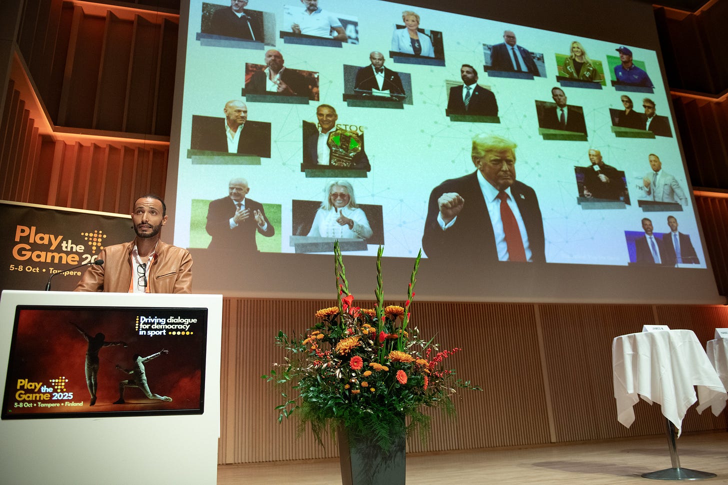 The way these sessions work is that each speaker is invited to give a 10-minute talk on a topic tied to the themes of the session, in this case, the “battle between sports and politics on U.S. soil.” While several of my esteemed colleagues focused on the upcoming 2026 FIFA World Cup and the 2028 Olympic Games in Los Angeles, I retreated to the familiar world of cagefighting, explaining to the audience how the UFC helped put Trump back in the White House. I also introduced my recently completed project for Play the Game that maps Trump’s extensive use of sports as both a personal branding tool and a central instrument of political power and public influence.