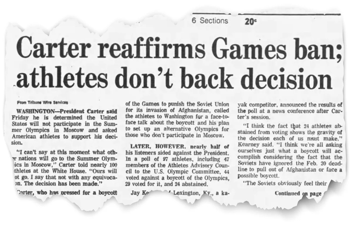 Despite Carter’s claim, both the domestic and international response to the boycott varied greatly. The closest US allies that ultimately joined the boycott were Canada, West Germany, and Israel. Great Britain and Australia also supported the boycott, although both sent athletes to the Games.